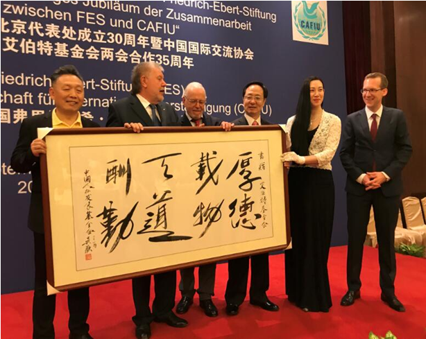 2017年9月5日,我会副理事长兼秘书长王建林应邀出席了由德国艾伯特基金会与中国国际交流协会共同举办的艾会驻北京代表处成立30周年暨中国国际交流协会与艾伯特基金会合作35周年的庆祝活动。中共中央对外联络部副部长、中国国际交流协会顾问郑晓松与艾伯特基金会主席贝克先生分别为庆?;疃麓?,德国驻华公使、欧盟驻华公使及来自中、德两国的嘉宾约100人出席了庆?;疃?。