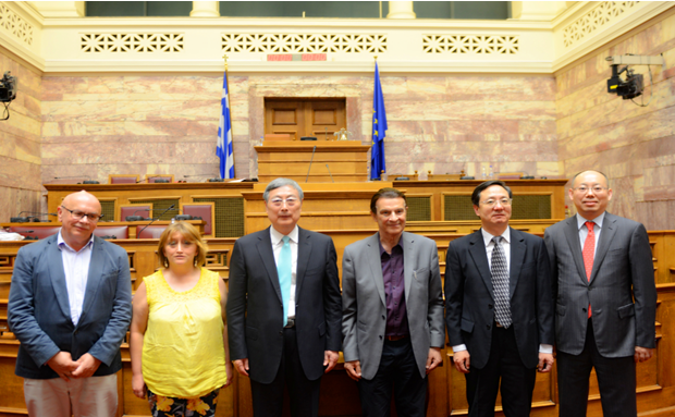 6月13日,黄孟复理事长率团访问希腊议会,会见了希腊议会第一副议长库拉基斯(右三)等希议会负责人