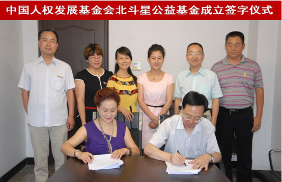 本网讯 7月12日,由中国人权发展基金会与甘肃信诚投资管理有限公司共同发起的中国人权发展基金会北斗星公益基金成立签字仪式在北京举行。甘肃新橙北斗科技信息服务有限公司向我会捐赠总价值300万元人民币的款物。我会主持工作的副秘书长王建林、基金项目部主任贾会霞、甘肃信诚投资管理有限公司董事长高萍、甘肃新橙北斗科技信息服务有限公司总经理陈清华等出席了签字仪式。
