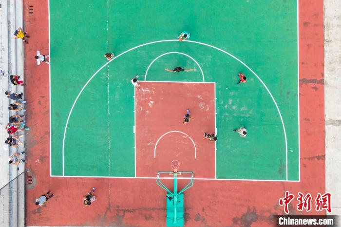 航拍江西省赣州市寻乌县太湖新村,篮球场上打篮球的村里学生。 刘力鑫 摄
