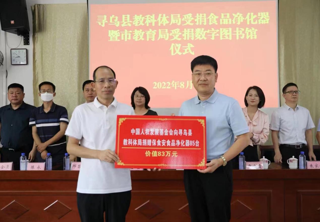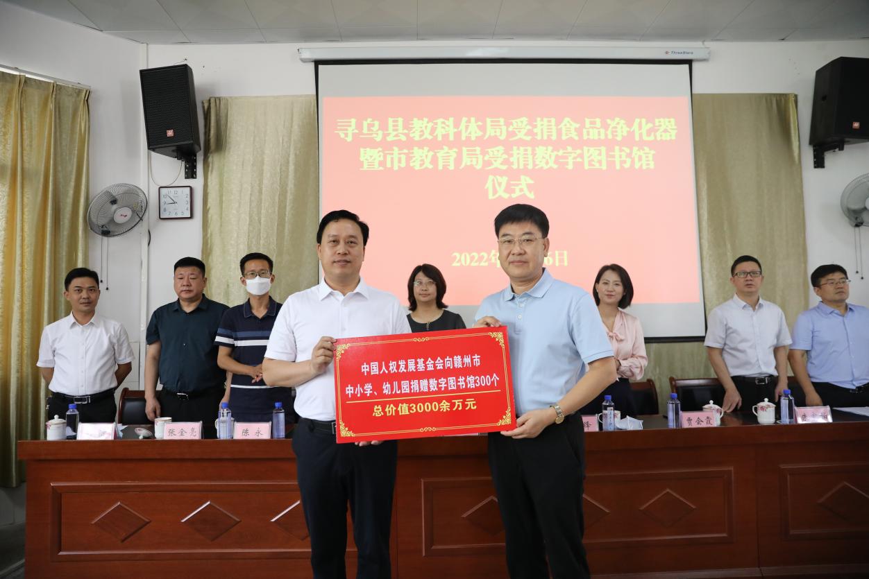 受教育权是公民的一项基本权利。为促进教育事业均衡发展,中国人权发展基金会书香中国文化基金向赣州市300所学校捐赠数字图书馆,星火基金向寻乌县教科体局捐赠85台食品净化器。