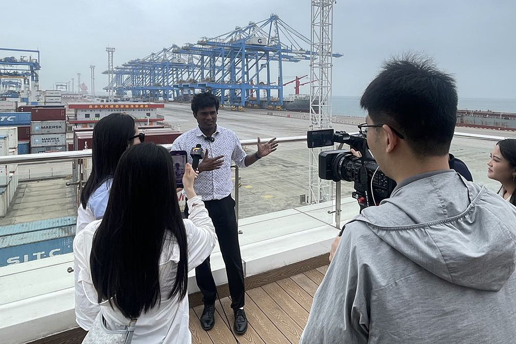 在采访中了解到码头开通的印度航线,和印度泰米尔邦的钦奈港连接在一起,双方经贸往来频繁,总台泰米尔语部外籍记者阿龙(印度)感到高兴和自豪。