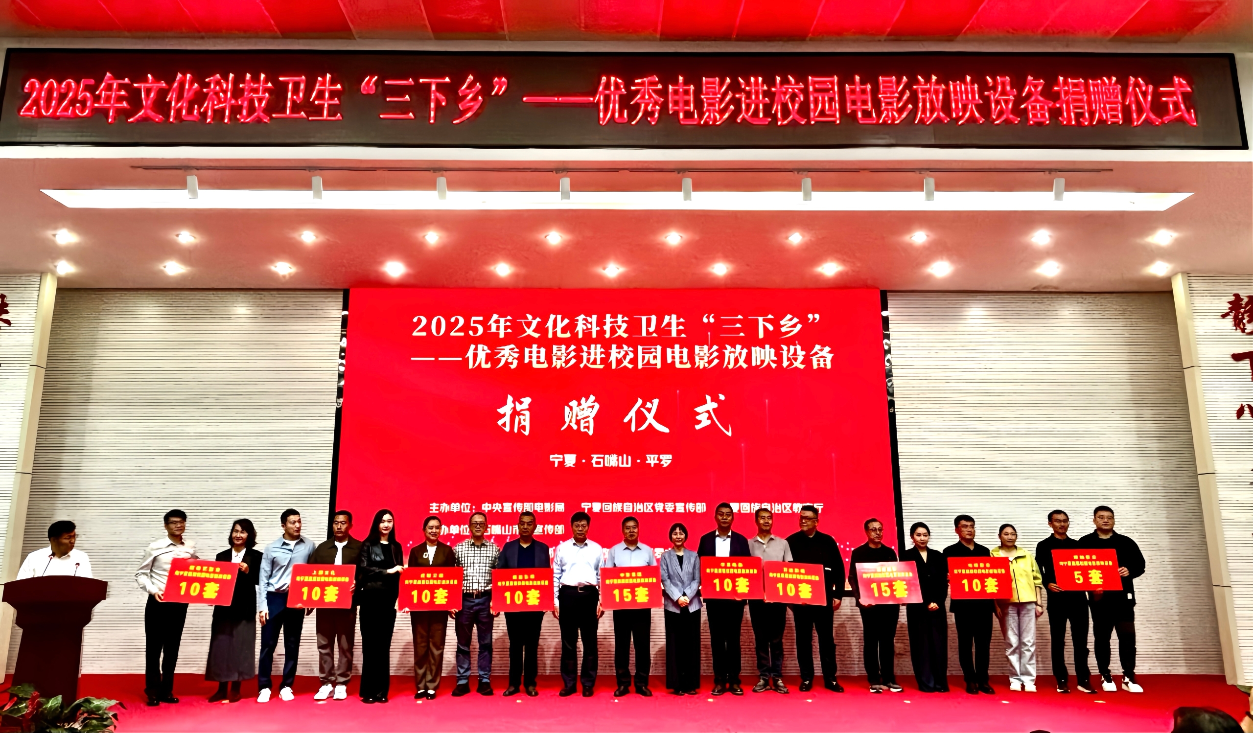 9月24日,由中宣部电影局、宁夏回族自治区党委宣传部、宁夏回族自治区教育厅共同主办的“2025年文化科技卫生‘三下乡’——优秀电影进校园电影放映设备捐赠仪式”在宁夏举行。仪式上,中国人权发展基金会联合中国电影集团公司、华夏电影发行有限责任公司、万达电影传媒公司、横店影视股份有限公司、猫眼娱乐、虎鲸文娱集团、光线影业、上狮文化、博纳影业、爱奇艺等10家电影企业向宁夏回族自治区捐赠了105套电影放映设备。